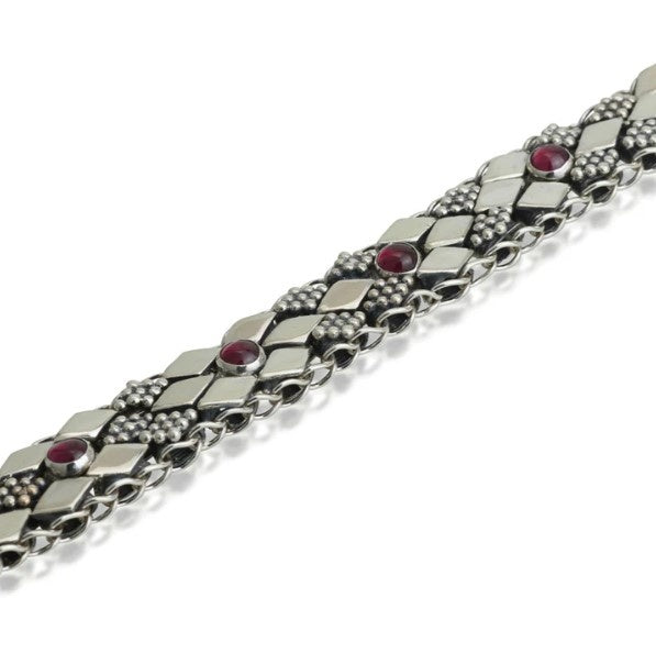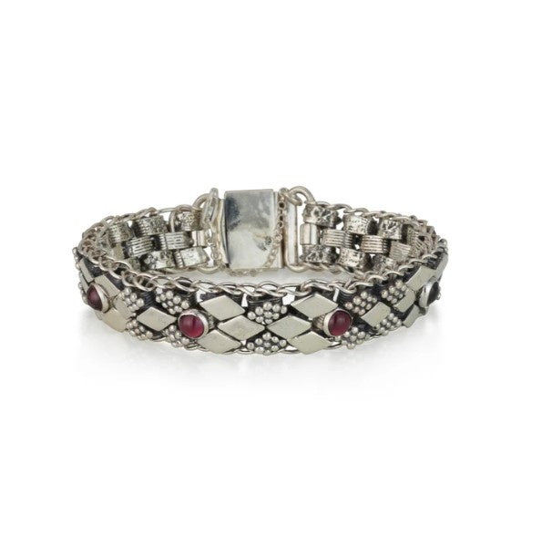 925 silver filigree bracelet set with garnet stones 925 sterling silver filigree bracelet set with Garnet stone. This hand made filigree Bracelet made by the artist Moshe Ben-David. Filigree work influence by Yemenite jewelry silversmith.