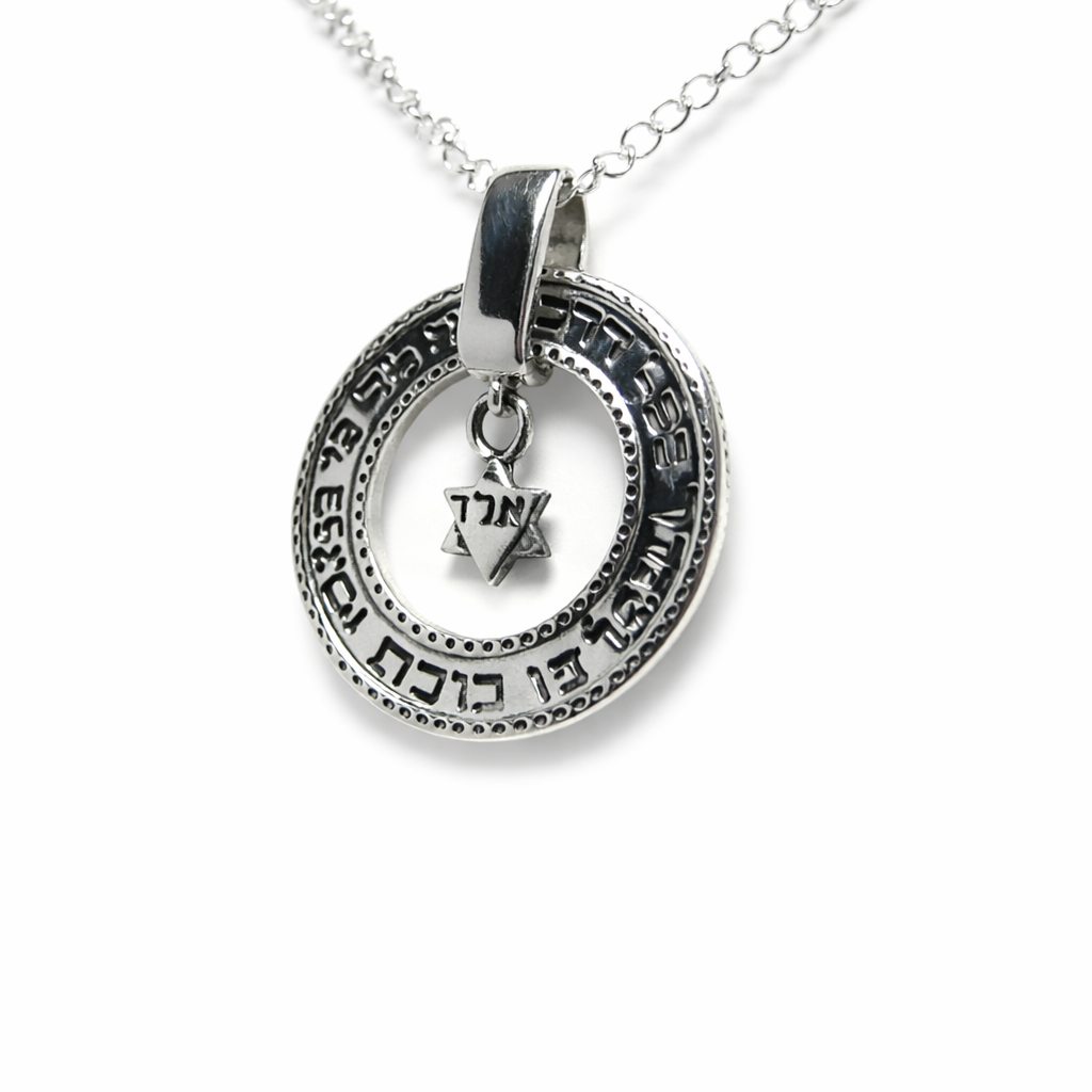 The necklace combines sacred prayer, Jewish symbolism, and Kabbalistic meaning, creating a meaningful piece that serves as a daily reminder of faith, protection, and inner balance.