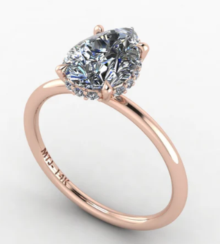 14K rose gold engagement ring featuring a pear-cut 2-carat gemstone, surrounded by delicate accent stones for a dazzling, elegant finish.