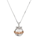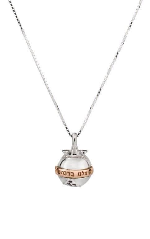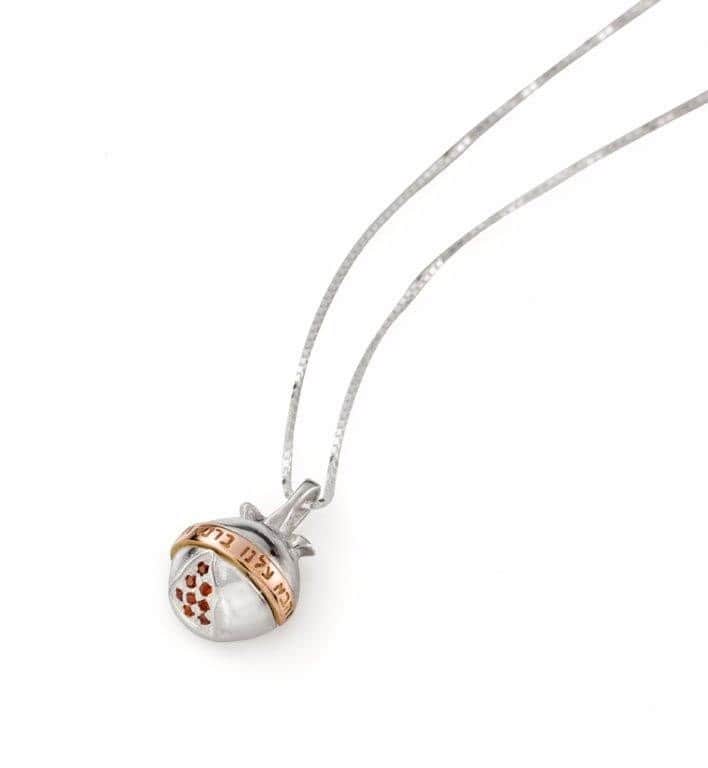 14K gold and 925 silver set with 8 garnet stones 1.3 mm Pomegranate - one of the most beautiful symbols. Because of its many seeds, it symbolizes abundance, wisdom, blessing and beauty. It is said that the number of pomegranate seeds symbolizes the number of commandments. As one of the seven species, and in addition to the blessing upon it and its beauty, it is also considered an accepted Jewish decoration. The inscription on the pendant is - "And may peace and blessings come upon us" - this pendant's virtue is protection and protection, bestowing upon a person blessing and peace in all his ways and all his deeds. Ruby stone - strengthens the life force of the body and soul, it is also known to strengthen fertility and abundance, gives vigor and vitality. Strengthens personal strength and the ability to realize and implement. Encourages expanding the boundaries of life and taking responsibility and leadership over others. Helps maintain financial stability, good for strengthening reproductive organs, the hormonal system.