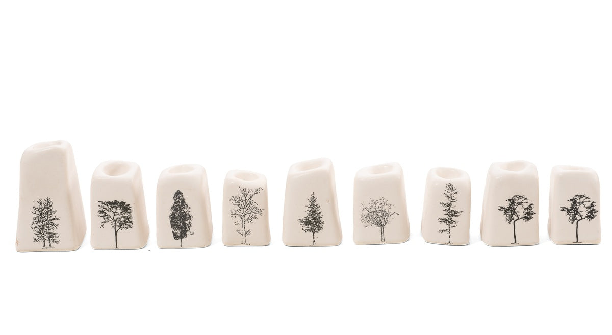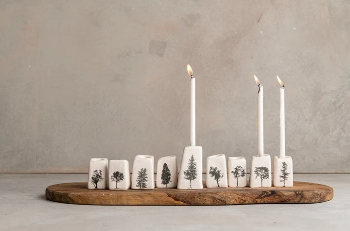 Modular Handmade Menorah with Israeli Trees This modular, handcrafted menorah is adorned with illustrations of Israeli trees (designs may vary). Fits candles with a diameter of approximately 2 cm.