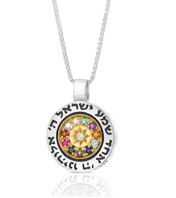 “Shema Yisrael” pendant — silver combined with gold, set with 12 natural gemstones (including a diamond).