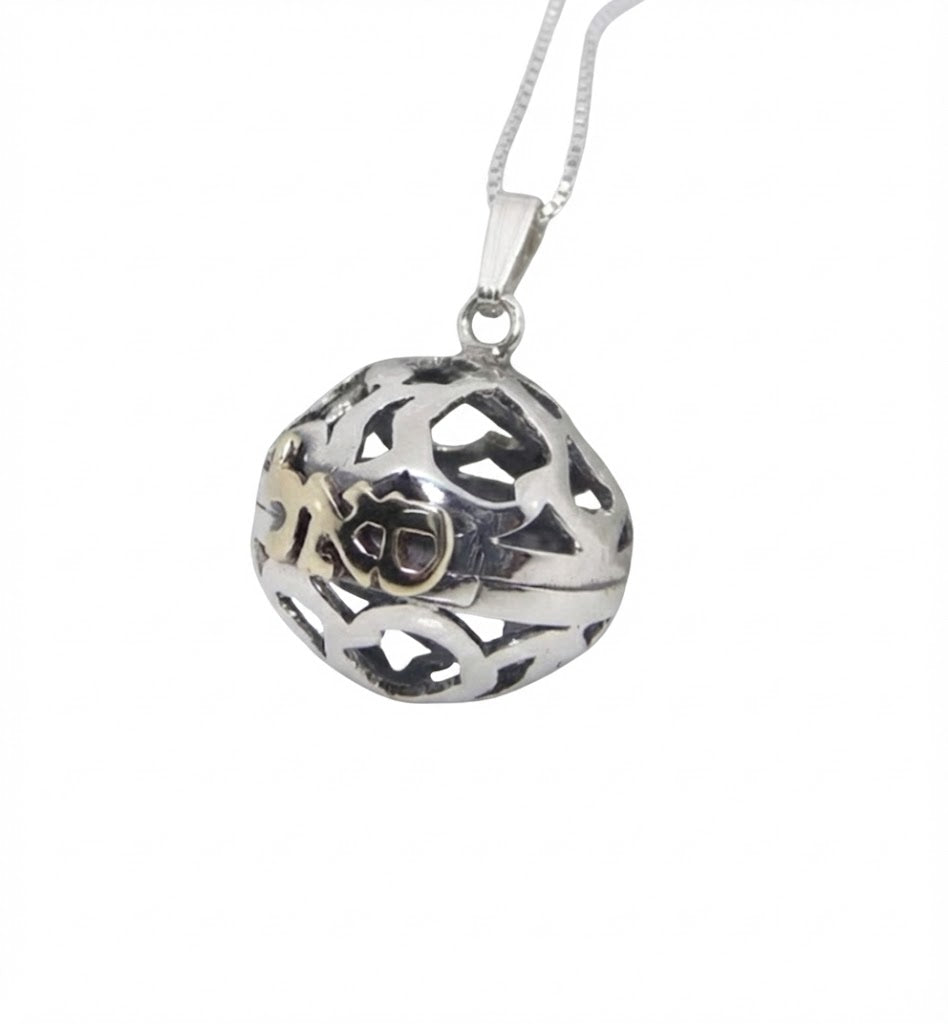 Sterling Silver Hollow Sphere Necklace with “SAL” (72 Names) for Prosperity