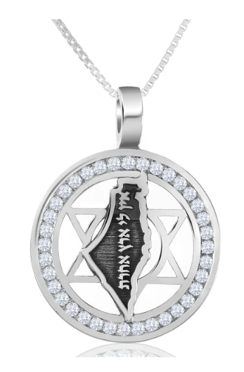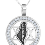 Unique silver pendant featuring a Star of David and the map of Israel, surrounded by white zircon stones and adorned with the raised inscription “Ein Li Eretz Acheret” (“I Have No Other Land”).