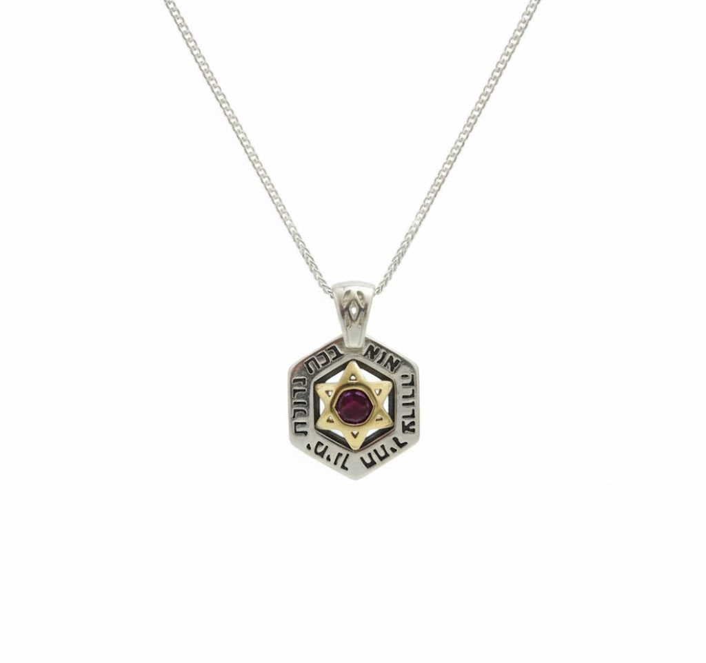 Hexagonal Silver Necklace with Ana B’Koach Blessing and Garnet Star of David