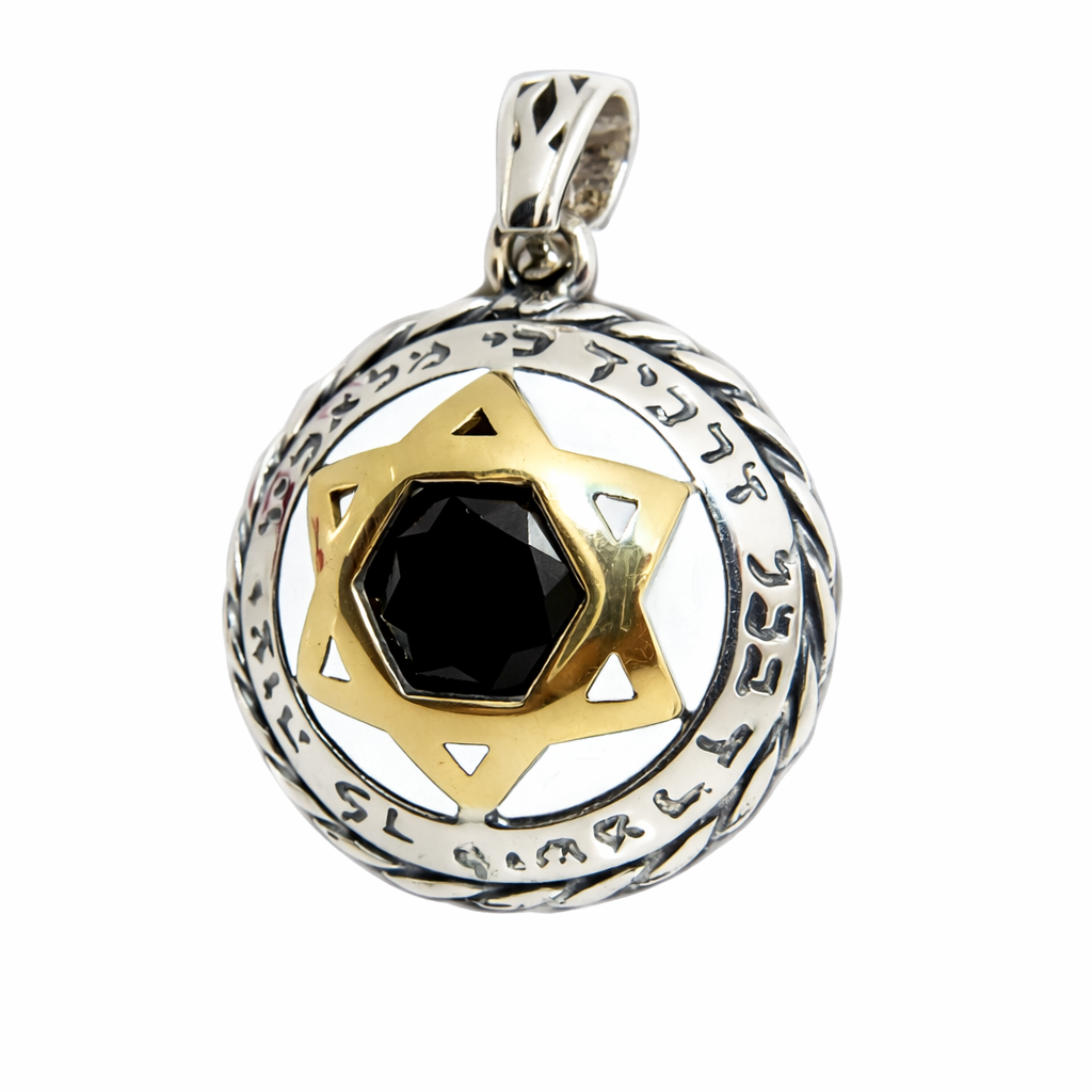 Silver & Gold Pendant Necklace with “Ki Malachav” Blessing, Star of David and Onyx Stone