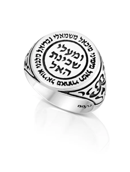 925 sterling silver signet-style ring engraved with the phrase “Shekhinat Ha’El.”