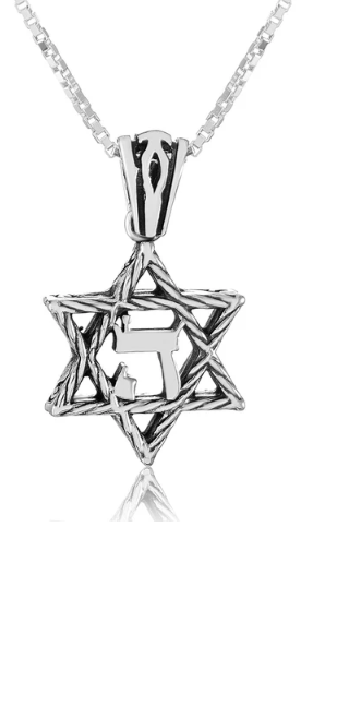 Interwoven Star of David pendant made of 925 sterling silver, featuring the Hebrew letter Hei – a symbol of divine presence and protection.