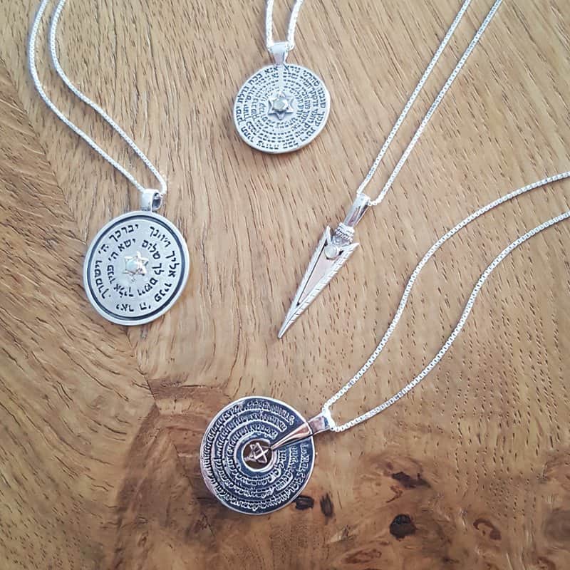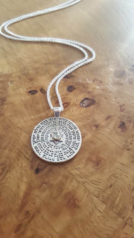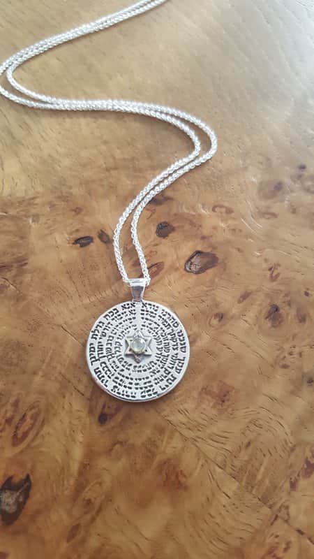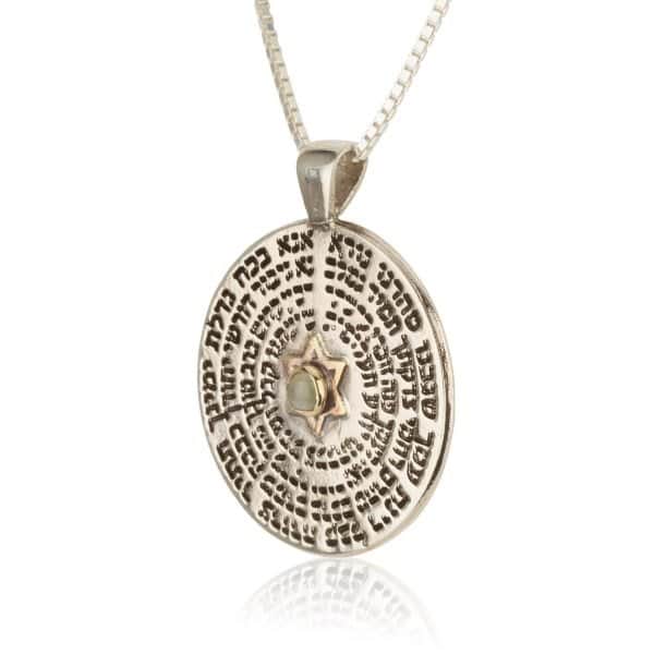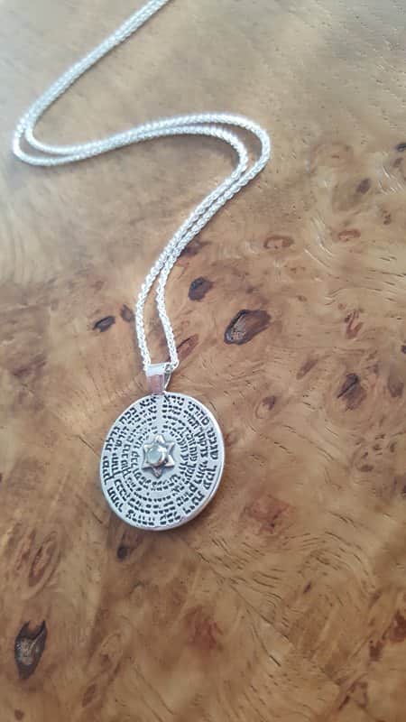 A unique round pendant that combines an ancient Kabbalistic prayer with a powerful gemstone, creating a piece of jewelry that is both a personal amulet and a striking design element.