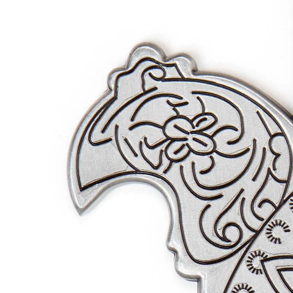 The hamsa (meaning “five” in Arabic) is an amulet in the form of an open hand, intended to ward off the evil eye and enhance good fortune. In Judaism, it has come to be associated with the Five Books of Moses and with God’s name, indicated by the letter heh – the fifth letter of the Hebrew alphabet. In Islamic tradition the hamsa is called the “Hand of Fatima,” after the daughter of the prophet Muhammad,‎ its fingers symbolizing the five tenets of Islam: faith,‎ prayer, charity, fasting, and pilgrimage.‎  This hamsa is a silver-plated replica of a synagogue lamp pendant from 18th-century Morocco. The original object is in the Feuchtwanger Collection, which was purchased and donated to the Israel Museum by Baruch and Ruth Rappaport, Geneva.
