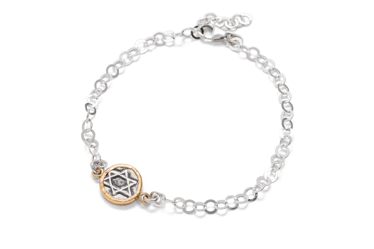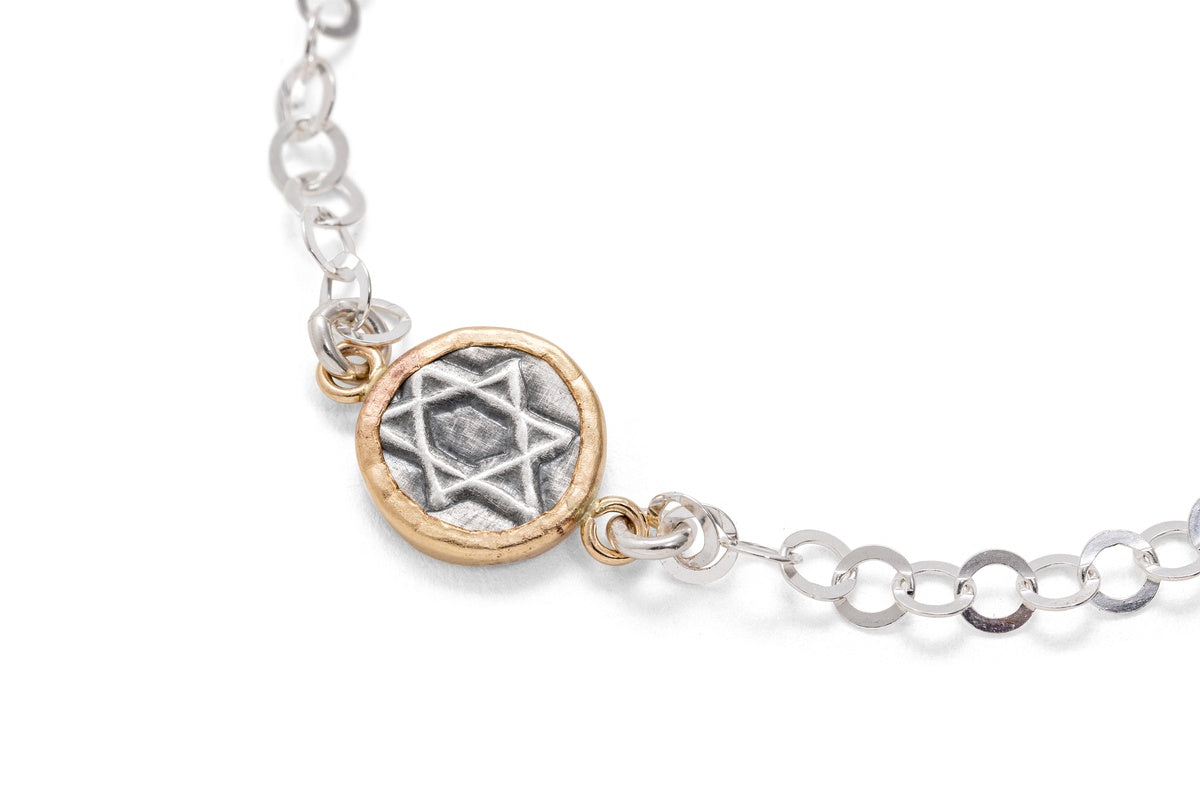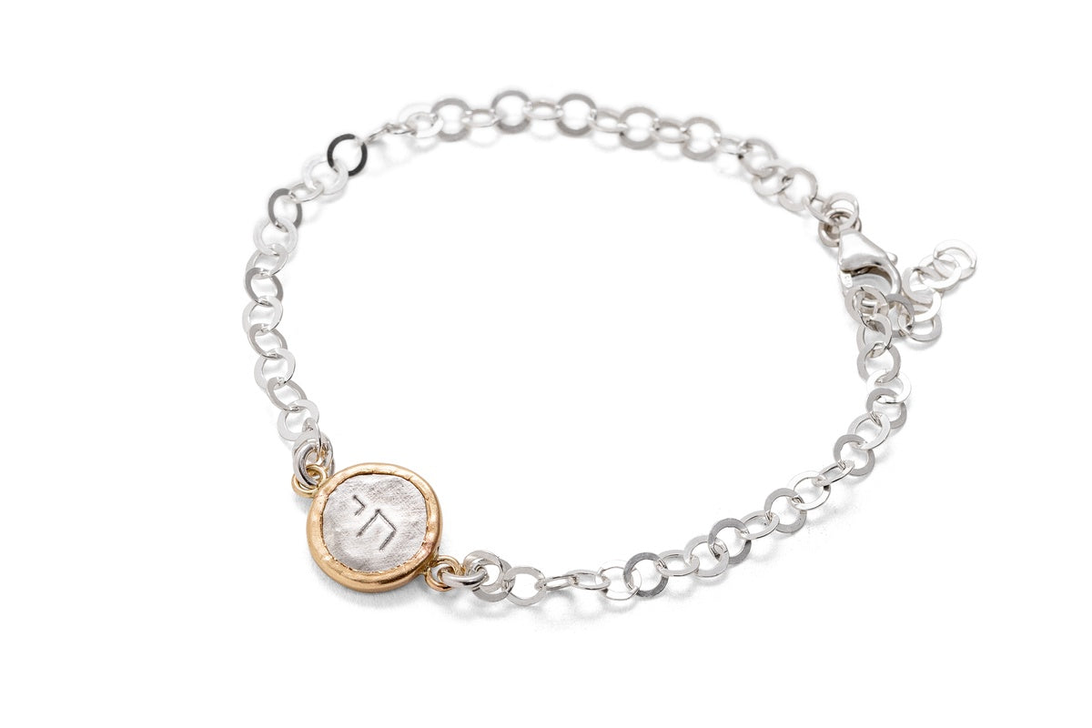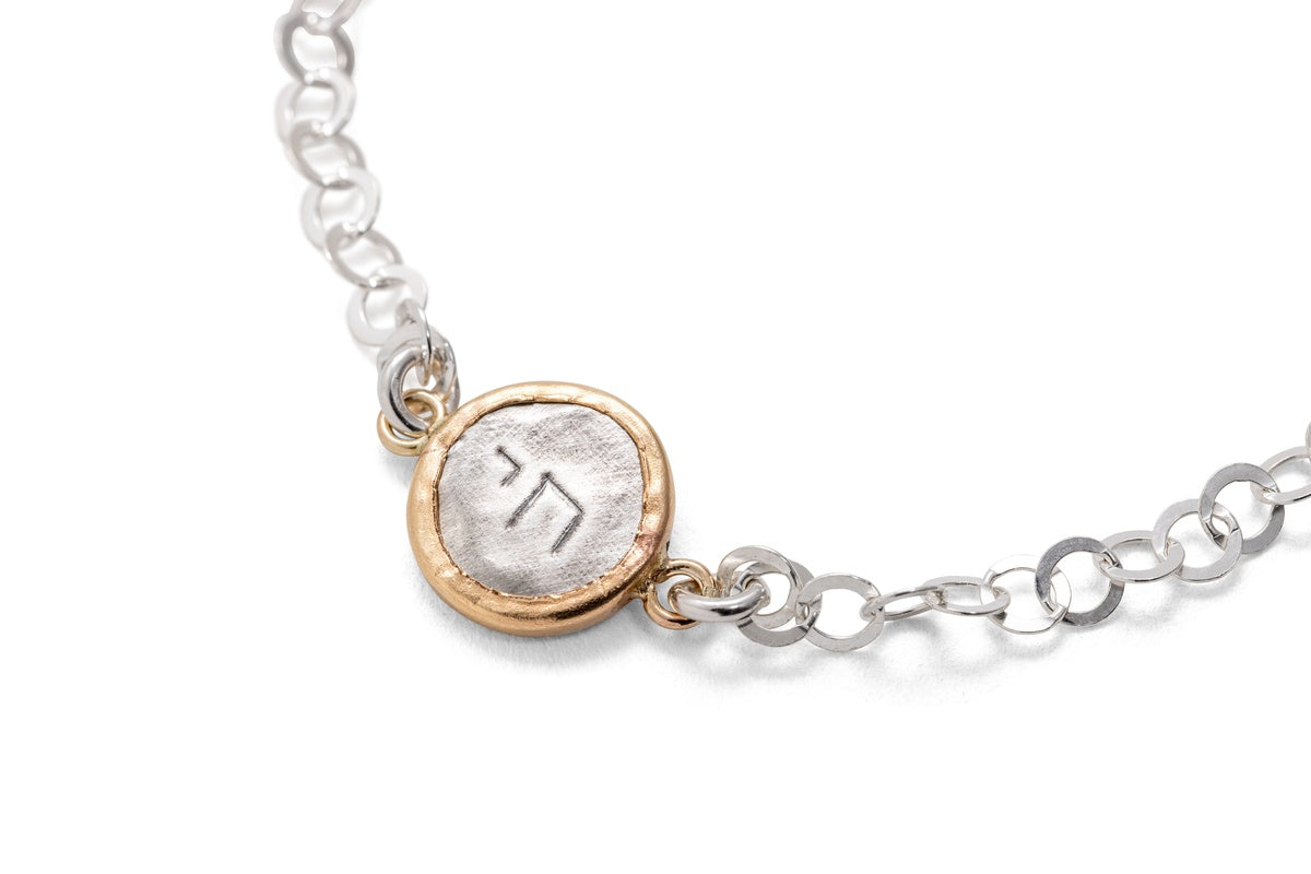 These pendants, made of sterling silver combined with 14 karat gold-filled. Goldsmith Kobi Roth's jewelry collection draws inspiration from the origins of Israel and the ancient culture of the region. The jewelry is made using an original technique of hand stamping on sterling silver. Each item is made manually on the jewelry table, so each item is unique and will always be slightly different and not identical to the previous one. These pendants are suitable for any age and can be an exciting addition to any jewelry box. The bracelets are available in several models.