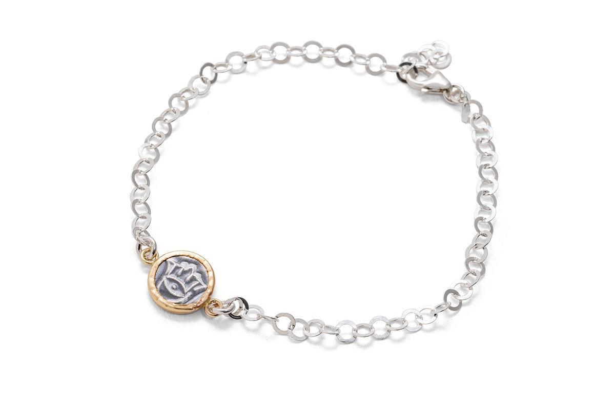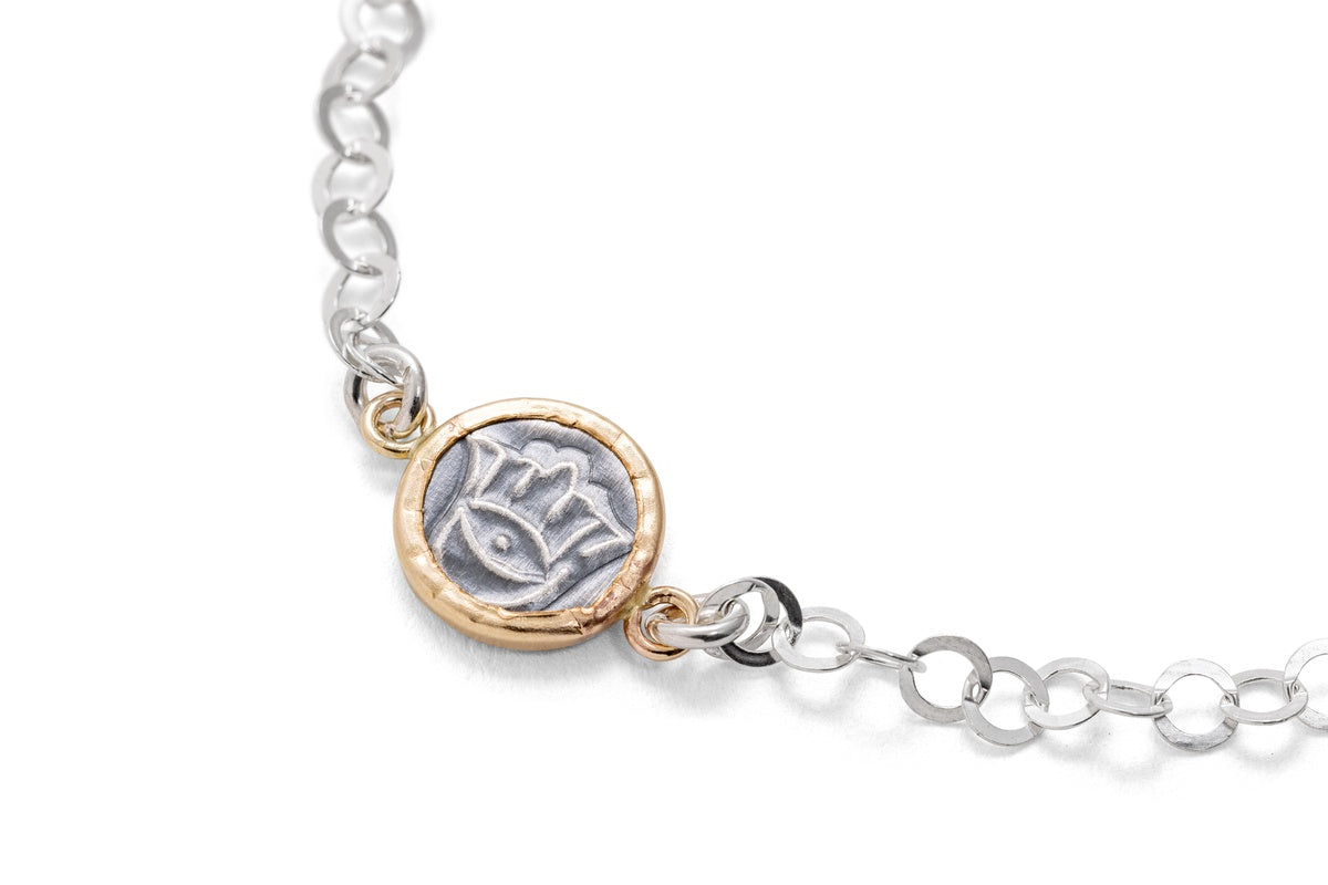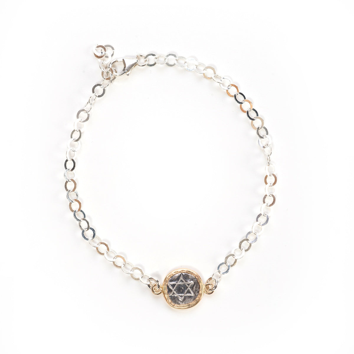 These pendants, made of sterling silver combined with 14 karat gold-filled. Goldsmith Kobi Roth's jewelry collection draws inspiration from the origins of Israel and the ancient culture of the region. The jewelry is made using an original technique of hand stamping on sterling silver. Each item is made manually on the jewelry table, so each item is unique and will always be slightly different and not identical to the previous one. These pendants are suitable for any age and can be an exciting addition to any jewelry box. The bracelets are available in several models.