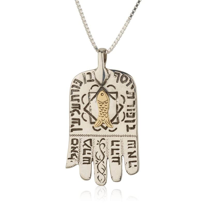 Silver Hamsa pendant, engraved with a Star of David and a dangling fish in gold, and Kabbalah combinations: S.A.L - financial abundance and livelihood M.H.S - medicine, health and longevity H.H.E - unconditional love S.A.H - finding a partner and strengthening a relationship. In addition to the hamsa, the verse "Ben Porat Yosef Ben Porat Eli Ha'ayin" for protection and protection from the evil eye